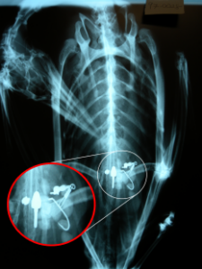 The x-ray of a dead loon demonstrating digestion of lead tackle (photo credit to MPCA).