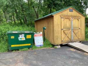 The food scrap dumpster is located in the back of the church parking lot along the woods. Free compostable bags are available from the self-serve dispenser near the dumpster.