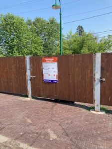 The food scrap dumpster is behind a wood fence with a Resource Renew sign on it. Free compostable bags are available from a dispenser attached to the fence.