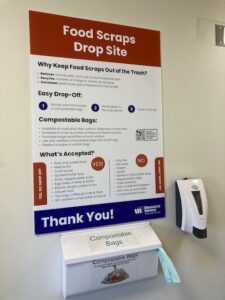 The food scraps dumpster is next to the white storage container in the parking lot. Look for the food scraps drop site signage. Compostable food scraps bags are available onsite from a bag dispenser.