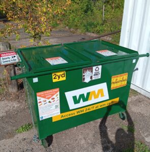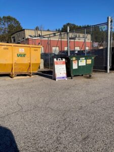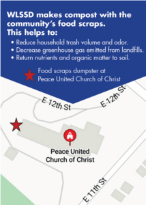 The food scrap dumpster is located in the back of the church parking lot along the woods. Free compostable bags are available from the self-serve dispenser near the dumpster.